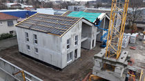 Pose d'un bardage bois sur les balcons et de tôle blanche pour la couverture et le bardage les bâtiments d'habitations.